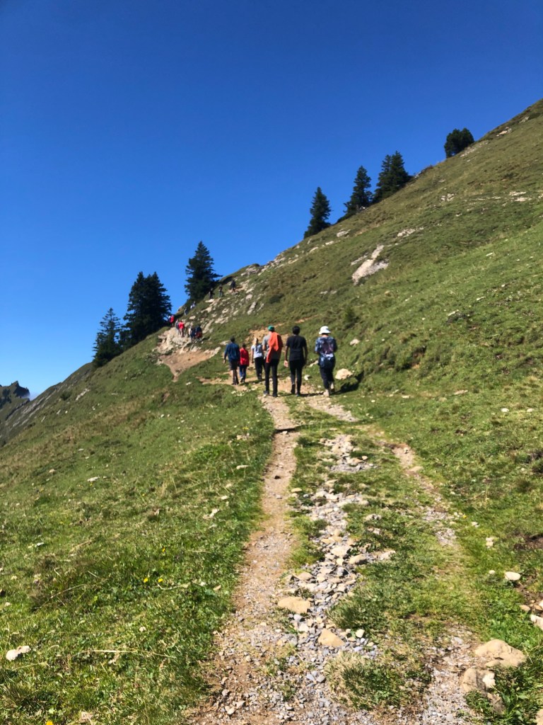 Am ersten Tag unseres zweitägigen Wanderausflugs, fuhren wir mit dem Zug um 7:50 nach Ziegelbrücke von wo aus wir mit dem Bus nach Amden fuhren. Nach einer kurzen Pause starteten wir unser anstrengendes Abenteuer. Davor wurden wir aber noch von unseren Lehren über eine Challenge unterrichtet, bei der wir Schneckenhäuschen zu sammeln hatten, die wir darauf zählen würden um somit einen kleinen Preis am Ende unseres Ausfluges zu erhalten. Darauf starteten wir unsere Tour. Diese war zunächst zwar anstrengend und sonnig, dennoch auf asphaltierten Strassen. Bis wir an unserem ersten Rastplatz ankamen, an diesem wir ein Foto schossen und daraufhin unsere Wanderung weiter antraten.