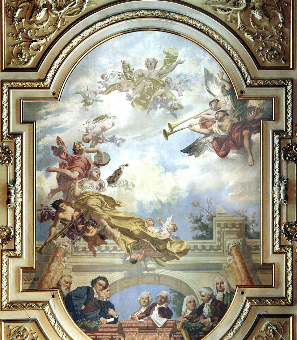 Das Gemälde, mit Portraits von Bach, Händel, Gluck, Haydn, Mozart, Beethoven, Wagner und Brahms.