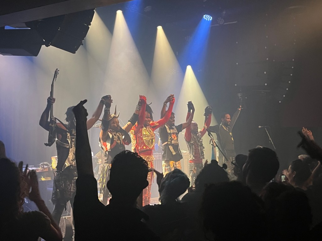 Ein Höhepunkt des Abends war aber ein längerer rhythmischer Aufbau, in dem sich Tempo und Intensität stetig steigerten. Die Musiker spielten sich gegenseitig an, reagierten spontan aufeinander und trieben den Groove immer weiter voran. Das Publikum folgte begeistert, klatschte, tanzte und ließ sich vollkommen auf den Moment ein. Sogar einige der Badmitglieder begaben sich in die Masse und tanzten mit dem Publikum. Es war eine Höllenstimmung. Die Stühle standen völlig leer, begeisterte Zuhörer wurden auf die Bühne gebeten um zu tanzen und die Veranstaltungstechniker*innen hatten bereits ihre Kopfhörer abgelegt.